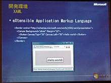 右のスライドは,XAMLで書いた「Hello, worldアプリケーション」(最もシンプルなアプリケーション)の例。XAMLを記述して,Hello, worldと描かれたボタンを表示させている。