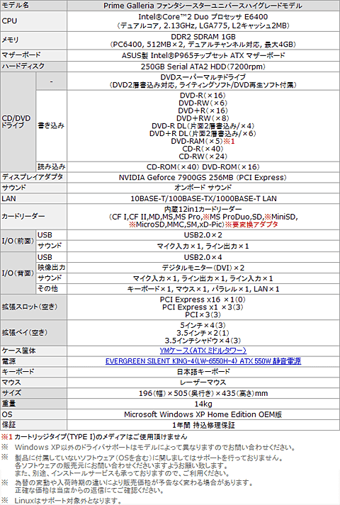 今回登場したのは,Core 2 Duoを搭載する「Prime Galleria ファンタシースターユニバース ハイグレードモデル」と,Athlon 64を搭載する「Prime A Galleria ファンタシースターユニバース スタンダードモデル」の2製品。いずれもBTOに対応しており,標準構成の価格は前者が14万9980円(税込),後者が10万9980円(税込)。いずれもグラフィックスカードにGeForce 7900 GS搭載製品を採用しており,3Dパフォーマンスという意味ではPSUをプレイするのに必要十分だ。