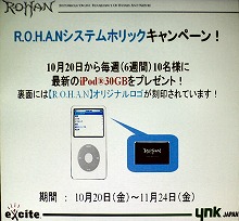 なお,10月20日(金)から11月24日(金)までの6週間,「R.O.H.A.Nシステムホリックキャンペーン」が実施される。 これは,R.O.H.A.Nのプレイヤー(正式サービス開始後は利用料金を支払ったプレイヤー)の中から毎週抽選で10名に,背面にR.O.H.A.Nのオリジナルロゴが刻印されたFifth Generation iPod/30GBがプレゼントされるというもの。当選者の発表は,毎週木曜日に行われる予定だ。 まだR.O.H.A.Nで遊んだことがないという人にもチャンスはあるので,これを機会にプレイを始めてみるのもいいだろう。
