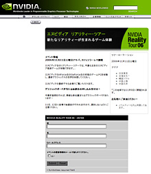 NVIDIAは,エンドユーザー参加型イベント「NVIDIA Reality Tour 06」を2006年11月11日(土),12日(日)の2日間にわたって開催すると発表した。場所は,PC系イベントではお馴染みの「カフェソラーレ リナックスカフェ秋葉原店」。NVIDIAの最新GPUと,最新ゲームタイトルに触れられる予定で,ゲーマーや,ゲームに興味のある一般PCユーザー向けの体験イベントになるようだ。