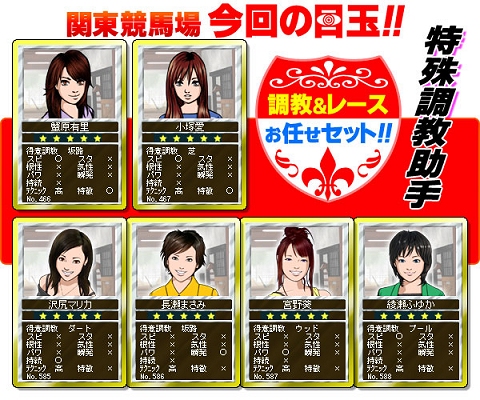 今回追加される特殊調教助手は,「蟹原有里」「小塚愛」「沢尻マリカ」「長瀬まさみ」「宮野葵」「綾瀬ふゆか」の6人。彼女らが調教した馬は特定のレースで強さを発揮するとのことだ。同時に追加される矯正具は,馬のスピード,スタミナ,持続力,パワーがアップするもので,計36種類追加されている。どちらも,ぜひ手に入れておきたいカードだろう。詳細は公式サイトの特設ページで確認してほしい。(Nobu)