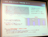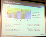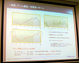 最初に講演を行ったのは,CDNetworks Japanの村上敏也氏。氏は,「トラフィック」という観点からのオンラインゲーム分析を,日韓のデータを紹介/比較しながら解説。まず,氏は韓国におけるデータを紹介しながら,韓国においてはオンラインゲームのトラフィック全体が増加傾向にあることを紹介。2005年1月と2006年1月のそれぞれの時点のトラフィックを比較すると,トラフィックが約2.5倍に膨れあがっているといい,2006年に入ってからは,100〜120Gbpsの間で推移する傾向が見られると説明。さらにジャンルごとにトラフィックの傾向なども提示し,カジュアルゲーム,ボードゲーム,MMORPGなどゲームの種類によって,トラフィックが集中する時間が異なると解説した。ちなみに村上氏が言うには,韓国では,ここ最近,ボードゲームが急激に人気(トラフィック)を集めつつある分野なのだという。 また,「まだ計測期間が短いので,なんともいえないのだが」と前置きした上で,日本のオンラインゲームにおけるトラフィックデータ(ダウンロード案件)も少し紹介。季節によってトラフィックが大きく変動する傾向があることを説明した上で,韓国では,4月,8月,12月にトラフィックが集中する傾向があるのに対し,日本は,3月,7月,11月にトラフィックが多くなるのだと解説した。 日本の推移を見る限りでは,春休み,夏休み,冬休みといった各シーズンに合わせてオープンβテストや正式サービスが行われるという傾向が,ダイレクトにトラフィックとして反映されているという見方ができそうなデータだといえよう。 講演を通して村上氏は,ゲーム会社におけるネットワーク技術者の不足をはじめ,内部でインフラを調達する難しさを指摘。ある一定の規模以上は,アウトソースしていった方が効率的であるとした。