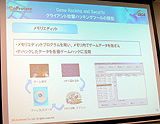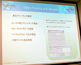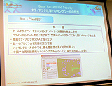 最後に講演したのは,Inca Internetの主席研究員キム・ソムボム氏。Inca Internetは,nProtect GameGuardというオンラインゲーム専用のセキュリティソリューションを開発した会社だが,nProtect GameGuardといえば,国内で高い人気を誇る「ラグナロクオンライン」や「スカッとゴルフ パンヤ」で導入されている対ハッキングプログラムであり,名前くらいは聞いたことがあるという読者も少なくないはずだ。 ソムボム氏の講演は,ゲームハッキングに関する現状と具体的な手法を淡々と説明するなかなか興味深い内容で,まずオンラインゲーム市場が急激に成長するにつれて,ハッキングの件数やハッキングツールの種類が爆発的に増加していると解説。また年々件数が増加するだけでなく,手口や手法が高度化する傾向も見られ,ハッキングの動機に関しても,レベル上げ目的や愉快犯的な動機のみならず,金銭獲得を目的とした組織的な活動が深刻化しているという,最新のハッキング事情を語った。 続いてソムボム氏は,スピードハック,メモリハック,パケットハックなどのハッキング手法を一つ一つ丁寧に紹介しながら,簡単なテストプログラムを用いた実演ムービーなどを紹介。PCのメモリ内にあるデータをどういう手順で解析していくか,またそれがどういう結果をもたらすかを説明していく。ハッキングに関する詳しい内容は,以前4Gamerで掲載した「こちら」の記事を参照してほしいが,最近のハッキング動向としては,パケットハックやマクロ/BOTの発展形ともいえる「Non-Client BOT」が増加傾向にあると,ソムボム氏は語る。 Non-Client BOTとは,クライアントおよびパケットを完全に解析した上で,正規のクライアントを使わずにログインからゲームの進行(狩り),そして終了までを行うダミークライアントのこと。ゲームクライアントに比べると非常に小さいプログラムとなっているため,一台のPCで数十のプログラムを同時に実行させるなどの使われ方をするのだという。 さて,上記の説明ですぐに想像できると思うが,これは明らかに「ゲームを楽しむ」という動機からは逸脱しているものであり,実際,主に中国や台湾の組織的なハッキンググループによって制作/使用されることが多く,もっとも悪質かつ対応が難しいツールとして位置づけられているという話。もちろん,これはRMT(リアルマネートレード)とは決して切り離せない問題であり,オンラインゲームというものが,オンラインバンクやそれに近い認識(お金を生むという意味で)で,悪質なユーザーの標的になっているという現実の現れでもある。講演の最後に,ソムボム氏はこう語った。