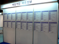 G★会場の隅,会場図で言うと右上あたりに割と大きなスペースを占めていたのが,「Job Korea」のブースだ。Job Koreaはその名のとおり,韓国内で業界を問わない求人/求職サービスだが,会場で展開されていたのはそのゲーム業界版ともいうべき「Game Job Festival」だ。 ブース右側手前には各社の求人票が貼り出され,その奥にはゲーム業界に就職するに当たっての相談所,奥突き当たりには適性診断のためのノートPC,そしてブース左側は,実際に人材を求めている企業に話を聞ける「Interview