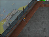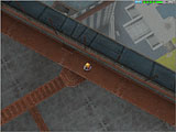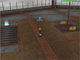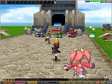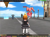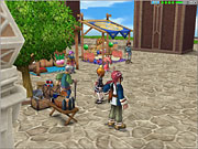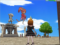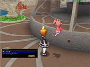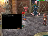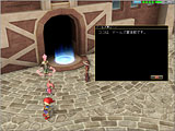 画面上段:大工場の側からも見える高台にある,噴水公園。街の中央にある坂を上ると灰色の巨大ピーノ像が見えてくる。入ると右手に商店が並んでおり,売買やポイントセーブなどが行える