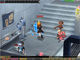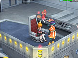 画面上段:赤いロボットも並ぶマシンナリー本部には,真実を見抜く眼鏡をかけたオペレーター風の青年と,マシンナリー代表が。背後にある席にはキャラクターを座らせることもでき,室内の雰囲気ともあいまって司令官気分が満喫できる(?)。本部を訪れたら一度は座らせてみたい