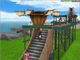 画面下段:工房都市トンカの本領ともいうべき,飛空庭大工場の様子。開けた土地に飛空庭組み立てのための大きな組み足場がある。そこには完成間近の飛空庭が見えるほか,材料を置くのだろうか,丸太が並んだ場所も見られる