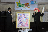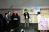 ECOに関係する主要人物がほぼ揃ったところで次に催されたのは,ECO放送局の出張版。「この一年を振り返って」「2007年の抱負」といった題に,出場者が絵や文字で回答を書き,ちょっとした説明でトークを進めるという流れは,ECOケットにおけるステージイベントのときと同じだ。 制作担当 岩田氏が,前者のお題に対して「気合い」,後者には「倒れるときは前のめり」と答え,宣伝担当の山本氏は山本氏で,イベントの準備もあってこのところドリンク剤を1日に5本ずつ飲んでいたという近況を語るなど,相変わらず聞いていて心配になる感じのネタトークが繰り広げられていた。以前ECOケットのステージで新婚ネタを披露した制作担当 浅間氏の回答は,前者に対して「人生いろいろ」,後者に対して「カタルシス」と,これまた私生活を絡めたかのように,微妙な含みを持たせた話題を披露した。 ちなみに植田佳奈さんは前者に対して「(ECOをプレイするためMacintoshから)ウィンドウズになりました」と回答,後者には「飛空庭につれこみます」と,いささかきわどく聞こえる答えを書いた。ちなみにこれは,原田ひとみさんの飛空庭に招待されたとき,うらやましくなったので自分も持ちたいという意味だそうだ。その原田さんは得意の絵で「走馬灯のようだった」「ハートフル」というメッセージを表現し,このコーナーの締めくくりは過去の番組内で披露されたと思しき,原田“画伯”の作品を次々と披露するスライド上映となった。 ECO放送局終了後は,レアグッズが当たる「じゃんけんタイニー」大会。ステージと来場者の間でじゃんけんをして,勝ち残った人に賞品が贈られるという,おなじみの内容だ。1回戦は緑のネコマタが入った「ECOビギナーズパッケージ(ファミマ限定)」が10名に,2回戦ではECOプレイチケット(第一弾〜第四弾コンプリートセット)が1名に贈られた。 そうした,来場者プレゼント企画の終了後は休憩時間を挟んで,いよいよ今回の目玉というべき,ECOの今後に関するステージ発表に入っていく。その前に,休憩のタイミングで来場者がどっと動いた物販要素について,少しく触れておこう。