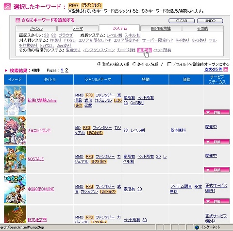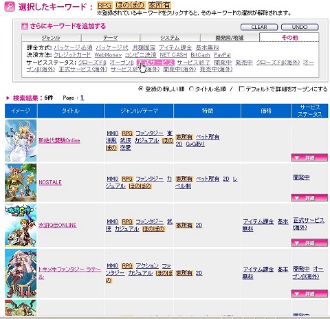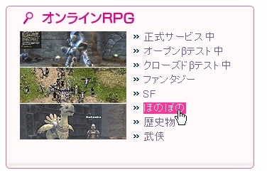 検索トップページでは,ゲームのジャンルごとに大まかな分類がしてあります。たとえば,検索トップページから「オンラインRPG」の部分を見ると, 正式サービス中 オープンβテスト中 クローズドβテスト中 ファンタジー SF ほのぼの 歴史物 武侠 といったものが並んでいます。「ほのぼの」を選んでクリックすると,ほのぼのしたオンラインRPGの一覧が表示されます。
