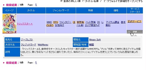 ●詳しい情報を表示する 検索結果の右部分にある「詳細」ボタンを押すと,開発/サービス会社や決済方法などの情報を表示できます。