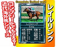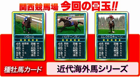 カード伝説とは,さまざまなアイテムがランダムで獲得できるミニゲーム。“近代海外馬”シリーズでは,エレクトロキューショニスト,ハリケーンラン,シロッコといったカードが用意されており,カードをコンプリートした人には,超レアアイテムの「EX種牡馬レイルリンク」カードがプレゼントされる。