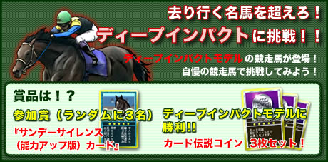 12月15日から5回にわたって開催される“去り行く名馬を超えろ!ディープインパクトに挑戦”イベントでは,ディープインパクトをモデルにした競走馬が「皐月賞」「東京優駿」(日本ダービー)「菊花賞」と同距離のフリーレースに登場する。 これらのレースに参加したプレイヤーの中から,ランダムで3名に「サンデーサイレンス(能力アップ版)」(カードNo,558)がプレゼントされる。また,レースでディープインパクトがモデルの競走馬に勝利した人には,「カード伝説コイン 3枚セット」(カードNo.216)がプレゼントされる。 なお,開催日程などの詳細は,公式サイトの告知ページを参照してほしい。(oNo)