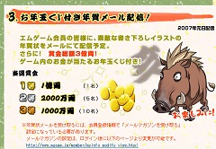 2007年元旦には,エムゲームジャパンから,登録会員全員(メールマガジン登録者のみ)に,熱血江湖のイラストレーターつたえゆず氏のイラストが入った年賀メールが発信される。なお,メールマガジンを受け取らない設定にしておくと届かないので,要注意。