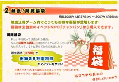 また,本日から2007年1月9日の間,玄勃派のNPC「チャンバン」から3万両で,「福袋」を購入できる。この福袋には,約25万両相当のアイテムが入っているとのことで,かなりお得な内容となっている。忘れずに入手しておこう。