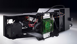 「Hot to Cool」と「Hybrid two-stage Cooling」。この二つのキーワードを略したものとされるH2Cは,BTXフォームファクタ用の巨大なCPUクーラーにポンプやラジエータ,そして電子制御の熱交換器を内蔵し,冷却液が運んだ熱を熱交換器とラジエータ部に取り付けられた冷却ファンでCPUの熱を筐体の外へ排出する仕様だ。同社はこれを空冷&水冷の「ハイブリッド型」と呼んでいる。