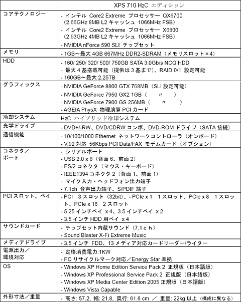 ●XPS 710 H2C Editionの主なスペック(BTO選択肢も含む ※リリースより)