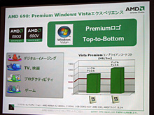 発表会で強調されたのは,AMD 690シリーズが,「Windows Vista Premium Ready PC」の基準を満たしているという点だ。これはMicrosoftのロゴプログラムで,簡単にいえば,AMD 690シリーズを採用したPCは,Windows Vistaがただ動作するだけでなく,Aeroデスクトップを含めて,快適に利用できるという“お墨付き”を得ていることになる。