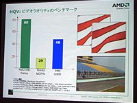 ところで,実際のデモはIntel製チップセット「Intel G965 Express」搭載PCを相手に行われたのだが,AMDが示したスライドには,NVIDIAの「MCP61」の名も刻まれていた。そこで,パートナーであるはずのNVIDIAを競合として紹介する点について確認すると,吉沢氏からは「ユーザーに選択肢を用意することが大切だ。スライドは,ラボで得られた客観的なデータを判断材料として提供しているだけなので問題ない」という回答が得られた。理に適っている一方で,NVIDIAとの微妙な関係を窺わせる発言ともいえそうだ。
