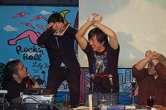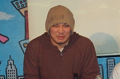 男色ディーノ選手といえば,布袋寅泰さんの「スリル」を入場テーマ曲にしていて,音楽に乗って男性客を襲いまくってディープキス&女性客にはグーパンチをするというような入場シーンでおなじみだが,今回のイベントではペコペコとおじぎをし,周囲に気を遣いながら登場。筆者の隣にいた観客などは,逃げ出す用意をしていたにもかかわらず肩すかしを食らったため,「え〜っ!」と露骨に残念そうな声を上げていた。っていうか,襲われたかったのだろうか。ヘンなイベントだ。