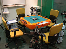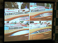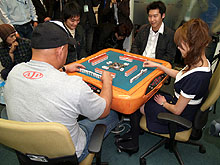 今回のイベント用に用意されたのは,麻雀用具「ささき」の提供による最新全自動卓「アモス・アルティマ」。これは最初から全員に配牌済みの状態で麻雀牌が卓から出され,さらに全員の点数をいつでも自動で読み取って集計してくれるという,全自動にもほどがある(?)麻雀卓だ。さらに卓には4台のカメラが設置され,対局者全員の手の様子がリアルタイムで,井出名人の実況する特設会場に中継される。ギャラリーは椅子に座りながら,大スクリーンに映し出される4人分の手の内を,井出名人の実況付きで楽しめるのだ。
