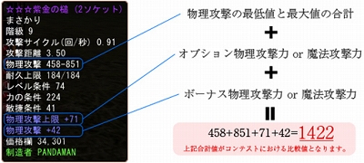 ※精錬によって追加された物理攻撃力も上記合計値に加算してください。 ※ソケットによるアイテム強化は比較値の対象外となります。 ※黄金装備は審査の対象外となります。 ※ 数値合計例
