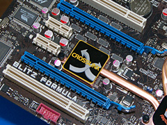 Blitz ExtremeとBlitz Formulaは,ともに2007年6月4日に正式発表予定となっているIntelの次世代チップセット「Intel P35 Express」を搭載したマザーボードだ。Blitz ExtremeがDDR3メモリ,Blitz FormulaがDDR2メモリに対応することを除くと,「Penryn」(ペンリン,開発コードネーム)世代の次世代デスクトップCPUとシステムバスクロック1333MHzをサポートすることなど,基本的な仕様は変わらず,以下のような特徴を持っている。- CrossFire動作時のボトルネックを解消する「CROSSLINXテクノロジ」(CROSSLINX:クロスリンクス)を採用