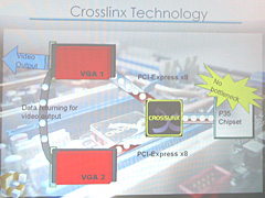 CROSSLINXテクノロジの概要。2本めのPCI Exrpress x16スロットがサウスブリッジを経由した4レーン接続にならないため,ボトルネックが生じないという