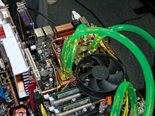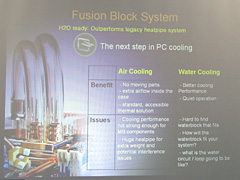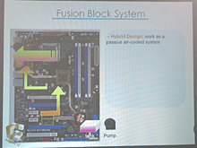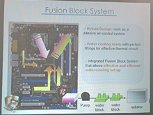 次にFusion Block Systemは,ノースブリッジ部を水枕にして,サードパーティ製の水冷ユニットと組み合わせることでBlitz Extremeを水冷化するものだ。「一般的なマザーボードで水冷システムを導入しようとすると,水枕を取り付ける場所が複数に及び,グラフィックスカードと水枕が物理的に干渉してしまったり,複数のポイントを冷却するためにポンプを大型化する必要が出てくる。その点Fusion Block Systemでは,ノースブリッジ部に水枕があらかじめ取り付けられているので手間が減るほか,拡張カードと干渉することはなく,ポンプもノースブリッジとCPUを冷却できるだけの規模のものがあればいい」と,Yu氏はその利点を強調していた。