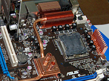 上段はBlitz Extremeにおける熱移動のイメージ。水冷ユニットを取り付けた場合には,ノースブリッジ部の温度が低くなるため,ここにすべての熱が集まってくるイメージだ。Blitz Extremeは空冷でも利用可能で,その場合はVRM部に熱が移動し,最終的にCPUクーラーの風でケース外へ出される。下は会場にあったデモ機とボードを撮影したもの