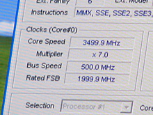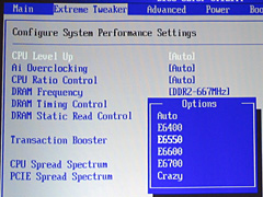 左上:CPU Level Upから,FSBクロックを500MHzに指定する「Crazy」を選択したところ,起動しなかった。そこで,一部手動で設定を行って無事起動……というデモ