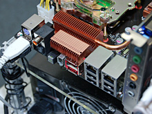 右下:熱を直接PCの外へ出せるようになったI/Oインタフェース部。「ゲーマー向けマウスやゲームコントローラはUSBが標準になったが,キーボードはまだPS/2が多い」(Yu氏)とのことで,キーボード用のPS/2コネクタが用意されている