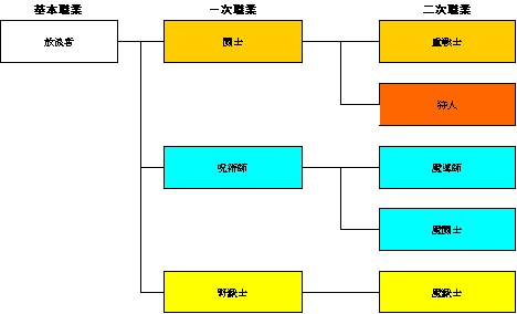 2次転職は,1次転職時点で3種類の職業から5種類の職業へと分化していく。各国とも,近接系,魔法系はそれぞれ2系統に分かれるのだが,特殊系(?)の職業は分化せずに,上位職に移行するだけとなっている。