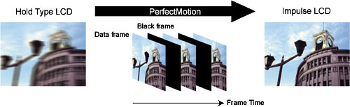 また,最近の液晶で,動画解像度を上げるために行われているのが「黒フレーム挿入」という技術で,FP241VWはPerfectMotionという名前でこの技術を採用している。液晶の反応速度からいうと,画像のブレはないはずなのだが,人間の目が動きを補正してブレを感じるというのがホールドタイプ(CRTなどと異なり,常に映像が表示されているデバイス)の欠点となっており,黒フレーム挿入とは,映像のコマとコマの間に真っ黒い画面を挟み,都度,画像を消すことで,人間が感じる残像感を抑制するというものだ。この方法は,輝度の低下やちらつき,フレーム数低下の懸念など,問題がないではないが,動画のブレを抑える処理として有効であることが知られている。