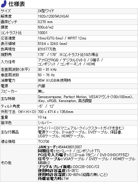FP241VWは,フルハイビジョンに対応した1920×1200ドットの解像度(WUXGA)を持ったディスプレイで,HDMI端子も装備,1080p映像の再生に対応している。 ゲーム用ディスプレイで重要なのは,まず液晶の反応速度である。FP241VWでは,反応速度で16ms,いわゆるオーバードライブ処理によって通常反応が鈍りがちな中間調(Gray to Gray)で6msを実現しており,秒間60コマでの映像再生にも余裕で対応している。