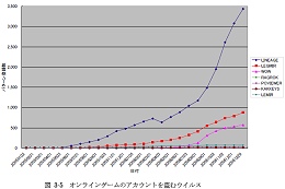 同レポートより,オンラインゲームを対象としたスパイウェアの推移。上からリネージュ,ミラの伝説,WoWなど