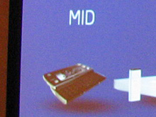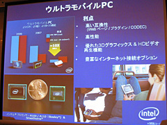 ちなみに,発表会の後で話を聞いたインテルの技術本部 技術部長の土岐英秋氏は,「既存のPCメーカーが作ると,“超小型のPC”になっていくだろう。対して家電メーカーは,それこそビデオカメラをMID化するなどといった,これまでにない製品を作ってくる可能性がある」と,一歩踏み込んだ見解を述べる。この場合,PCメーカーからは現状のUMPCをさらに進化させたようなMIDが,Windowsという“縛り”のない家電メーカーからは,それ以外のMIDが登場するといった感じで,大きく2種類のMIDが登場しそうだ。