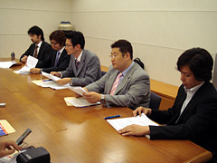 「有限責任中間法人 日本オンラインゲーム協会」の設立発表時に紹介された,会長のゲームポット 植田氏以下,理事四氏(本文参照)