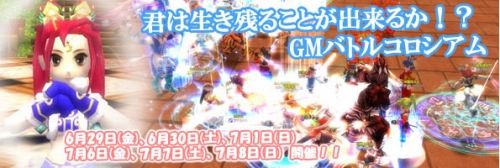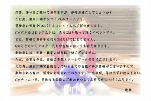 GMバトルコロシアムイベントを開催いたします! GMバトルコロシアムでは、GM(ゲームマスター)チームと戦っていただきます。イベント中、GMとともにモンスターたちが出現し、皆様の前に立ちはだかります! 仲間と力を合わせ、GMとモンスターを撃退しましょう!!