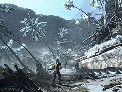 デモの舞台となっているのは海辺の小さな村。敵兵がいたるところにいるその村に,プレイヤーキャラクターが攻撃をかけるという設定だ。頼れるのは,アメリカ軍のハイテクの粋を尽くした“ナノスーツ”だけ。とはいえ,ダッシュしてよし,ジャンプしてよし,透明になってよしと,ナノスーツはちょっと卑怯なくらい強い。 ムービーを見てもらえば分かると思うが,グラフィックスの話ばかり優先して,なかなかそのゲーム性が見えてこなかったCrysisは,意外なほどランボーアクションを楽しめる爽快なFPSとして開発が進んでいるようだ。CryTekの前作「Far Cry」同様,マップは広く,攻撃方法だけでなく攻撃ルートをさまざまに選べるところに戦略性がある。Far Cryには難度が高すぎるという問題があったが,Crysisではその点をナノスーツの強力さによってバランスを取るというゲームデザインになっている。 もっとも,しばしば敵兵が棒立ちになっているシーンも見受けられ,ナノスーツの強力さと相まって,今回は難度の低さが問題になってしまうかもしれない。もちろんこれは,派手なシーンを次々に見せるデモ用にチューンされているからかもしれないので,なんともいえないが。 発売日に関しても,2007年8月が噂されてはいるものの,Electronic Artsの担当者はあくまで「なんとも言えない」という態度を崩さず,もしかしたら……という気もしないでもない。さまざまな日程はすでに決定されているらしいが,それがいつだかはトップシークレットというわけ。いつもながら隔靴掻痒な感じで,どうもすいません。 まあ,いずれにせよゲームの完成度は決して期待を裏切らないものになっているようだ。さらに,新たに公開されたグラフィックス8点も合わせて掲載するので,直撮りムービーでぜひ盛り上がってほしい。(松本隆一)