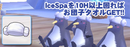 7月19日(木)定期メンテナンス終了後より、新コース「IceSpa(アイススパ)」を実装します。 こちらを記念して、8月2日(木)メンテナンス開始時まで「IceSpa」を10H以上周ると新アイテム「お団子タオル」をプレゼントするイベントを実施します。 「お団子タオル」は「IceSpa」に登場するペンギンたちがかぶっているかわいい衣装アイテムで、それぞれのキャラクター用として8種類あり、取得条件を満たすとこのうちランダムで1種類獲得することができます。 また「お団子タオル」は期間限定にてが販売も致しますので、もしお気に入りのキャラクター用の「お団子タオル」を獲得できなかった場合でも確実に入手することができます。 また7月26日(木)定期メンテナンス開始時までは1日1回ログインすると経験値2倍の効果を持つ「もっちアイス」を5個プレゼントします。 プレゼントは1アカウントにつき1日1回となっており、7月26日(木)までに最大で40個獲得することができます。 とってもお得なこの期間に沢山アイテムをゲットしてください。 「お団子タオル」プレゼントイベント期間: 7月19日(木)メンテナンス終了後 〜 8月2日(木)メンテナンス開始時まで 「お団子タオル」詳細(全キャラクター共通) ・アイテム名:お団子タオル ・能力:スピン+1,スロット+1 ・価格:35CP ・販売期間:7月19日(木)メンテナンス終了後 〜 8月2日(木)メンテナンス開始時まで ※「お団子タオル」のプレゼントは1日につき1個のみとなります。 ※すでにいくつかのキャラクター用の「お団子タオル」を所有している場合は、別の(所有していない)キャラクター用の「お団子タオル」をプレゼントします。 ※全ての種類の「お団子タオル」を所有している場合はプレゼントの付与、購入はできません。
