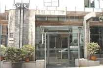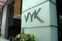 VYKARIANの外観。入り口では,シン氏の友人が制作した銅像が訪問者を迎える。外観と同様に,社内もガラスなど透明な素材が多く使われている