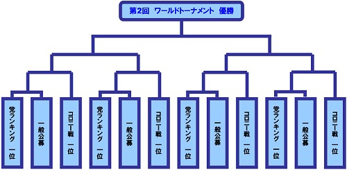 ■ 日程 予選 (9月14日、16日 20:00〜22:00) 決勝戦 (9月28日、30日 20:00〜22:00) ※ 試合日程は変更される場合もございます。 第2回ワールドトーナメントの対戦表、ルール、詳細日程等は後日改めてお知らせいたします。