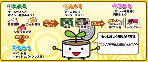 まずは同サイトで行われている,広告主の各種「プロモーション」に参加することで,「ポイント」と「ゲームコイン」を獲得できる。どういったプロモーションがあるかは,「こちら」を見てみよう。 「ポイント」はキャッシュバック用のものであり,「ふえるの缶詰」で使うのは「ゲームコイン」のほう。このゲームコインを「チップ」に交換することで,サイトに用意されている「麻雀」「大富豪」などのゲームを楽しめる。さらにプレイした結果に応じて獲得した「バリュー」を溜めると,さまざまな景品と交換できる仕組みだ。