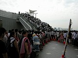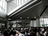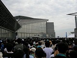 東ホールから西ホールへ向かう人達。連絡通路を抜け(写真左),いったん外の階段へ迂回し(写真中央),コスプレ広場の前を通ってようやく到着。ひたすら果てしない行列だ……