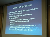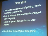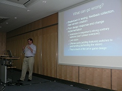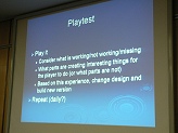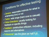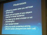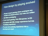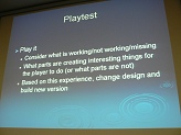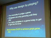 では,なぜこのような(確実にプログラマは眉をしかめるだろう)方法を使うのだろうか?(※編集部注) まず,「面白いのかどうか」は,(企画書/仕様書などでなく)プレイをベースに考えるべきであるという,当然といえば当然の,しかしながら実際には忘れられがちな原則が挙げられた。またShelley氏は,どんなにベテランのゲームデザイナーといっても,実際にプレイしないことには,そのゲームの良い点/悪い点が本当には分からない,とも語った。事前に面白そうと思っていても,いざ動かしてみたら,想像と全然違ったというのは,よくある話なのである。そしてもう一つ,最近のゲームは要素が多いので,それらがちゃんと消化できているのかを確かめるにも,この手法が適しているとのことだった。