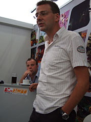 「Black Prophecy」について説明してくれた,ReakktorのHolger Nathrath氏(右)と,Kark Lenke氏(左)。彼らのスペースコンバットに対するこだわりは相当なものだ