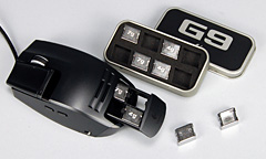 重量を計測してみると,195cm長のUSBケーブルを含んだ状態で本体は132g。29gの幅広グリップ装着時に161g,25gのドライグリップ装着時に157gとなっている(※ケーブルを含まない状態の公称重量は順に110g,109gだが,2個のグリップには実測で4gの差があるため,公称値の信頼度には少々難がある)。 ケーブルに違いがないとされるG5を同条件で計測すると162g。グリップを取り付けた状態のG9はG5とほぼ同じ重さであり,この状態からマウスを重くしたいという(ゲーム用途での)ニーズは,今回もあまりないように思う。 ちなみにウエイトカートリッジの重量は3gだったので,ウエイトカートリッジを取り外した状態でグリップを取り付ければ,それぞれ3gずつの軽量化が可能だ。
