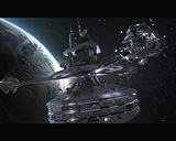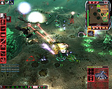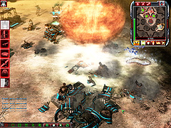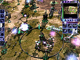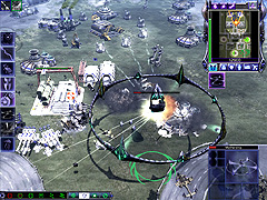 | 映画「インディペンデンス・デイ」を思わせるScrinのマザーシップは,Scrinでプレイするときには必ず利用したいユニットだ。非常に高価なうえに,ゆっくり移動するため,敵地に近づくと大反撃を受けてしまうが,うまくビームを撃てれば,目標周囲の敵施設やユニットまで連鎖的に爆発して迫力満点。また,敵がマザーシップを出動させるとアナウンスが流れるので,早めに対処しよう |