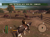 | この時代といえば,やはり金。いくらゴールドラッシュに沸いた時期とはいえ,本当あちこちに金山がある | 賭けポーカーで小銭稼ぎ。これで一攫千金も? とドキドキしたが,残念ながら報酬は一定。チッ | 馬を使って,牛や馬を囲いまで追い込む牧歌的なミッション。面白いけど,俺様を誰だと思っているんだ |