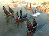 | 太鼓を叩きながら行進するTrollやGiant Spiderなどの一団。こんなのがプレイヤーの砦にやってくるのは相当怖い | Elfのロングボウアーチャーに,Mordorのブラックライダーが突撃。ブラックライダーは,一度は使ってみたいユニット | 海戦用のユニットは光と闇の勢力に2種類ずつ。輸送船にユニットを押し込んで,敵の背後から上陸させることも可能 |